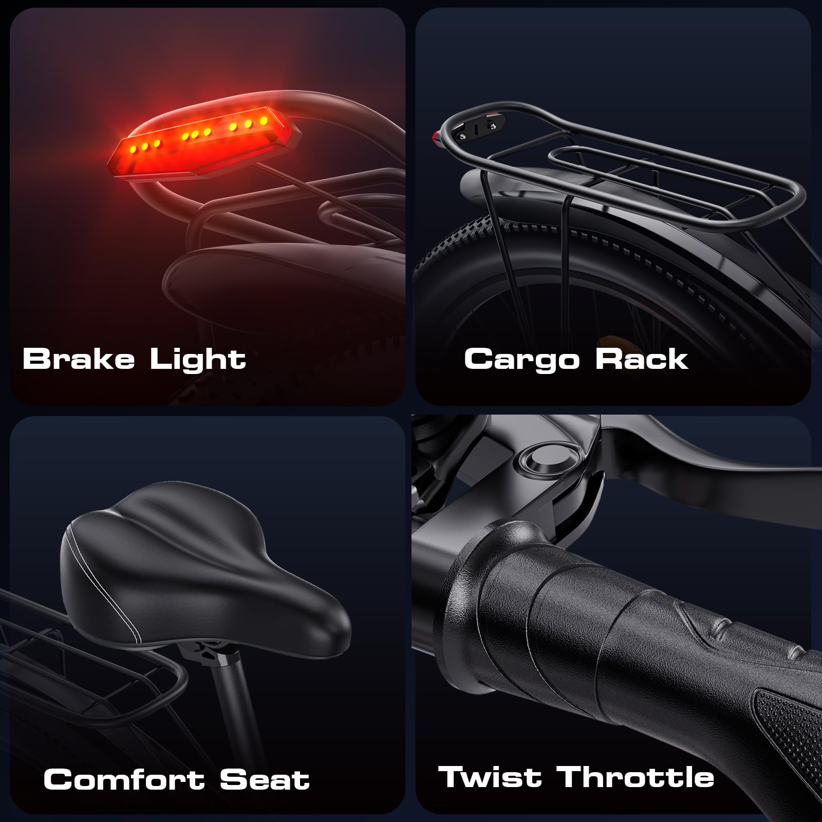 - 🚲 【Upgraded Configuration】Featuring sturdy 6061 aluminum frame, colorful LED display, 21-speed gear kit, turn signal light, big bright headlight, twist throttle, shock-absorbing saddle, solid cargo rack, front & rear fenders, and built-in battery.