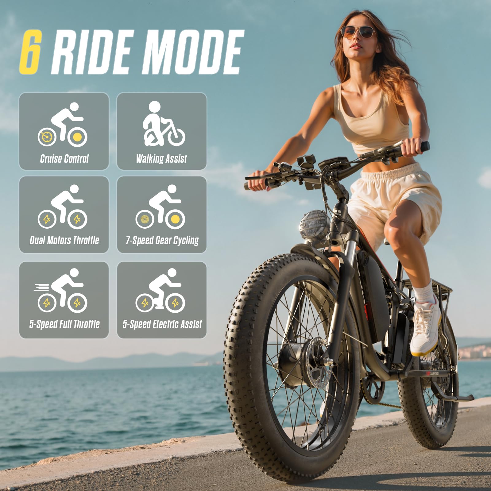 - 🚲 【6 Working Modes】 1. 1 Motor Full Throttle: Offers 5 speed levels for daily commuting. 2. 2 Motors Full Throttle: Utilizes both motors to tackle hilly terrains. 3. Pedal Assist: Extends riding range to ensure long-distance travel. 4. Regular Biking: with a 7-speed gear system for easier riding. 5. Walking Assist: Allows for effortless pushing of the bike. 6. Maintains a consistent speed, preventing muscle tension or driver fatigue caused by erratic acceleration/deceleration.