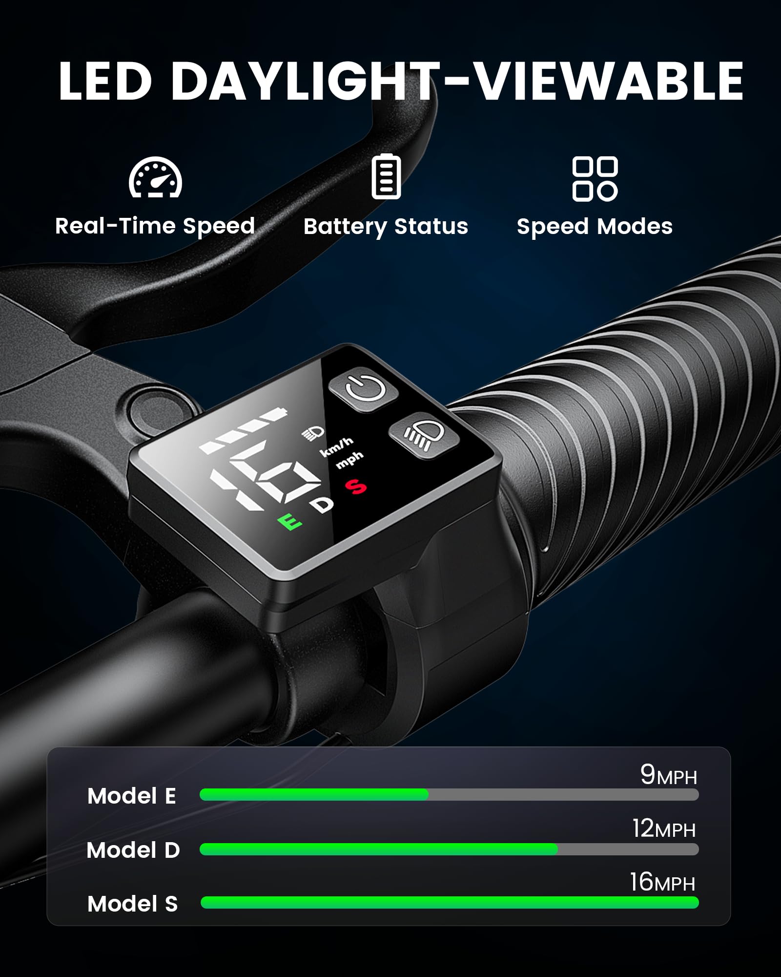 - 【Stable Braking & Comfortable Control】 Stay safe and steady with a dual braking system, front and rear lights, and 12-inch air-filled tires that provide reliable grip on city streets, sidewalks, or park paths. Choose from three adjustable speed modes (16/12/9 mph) to match your comfort level and riding environment.