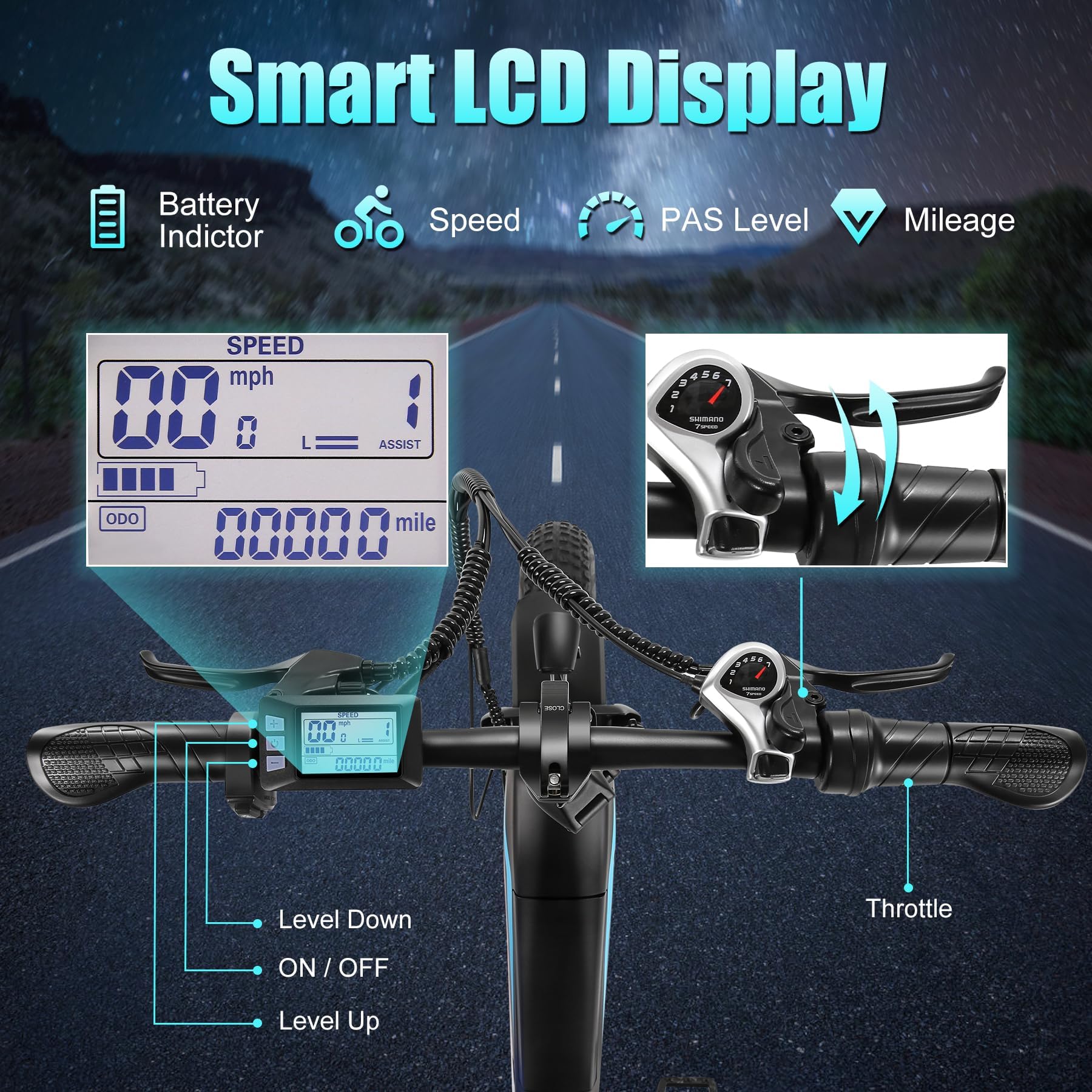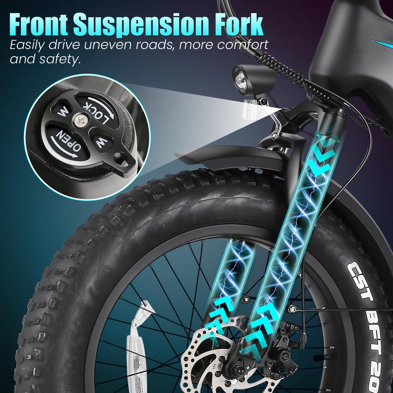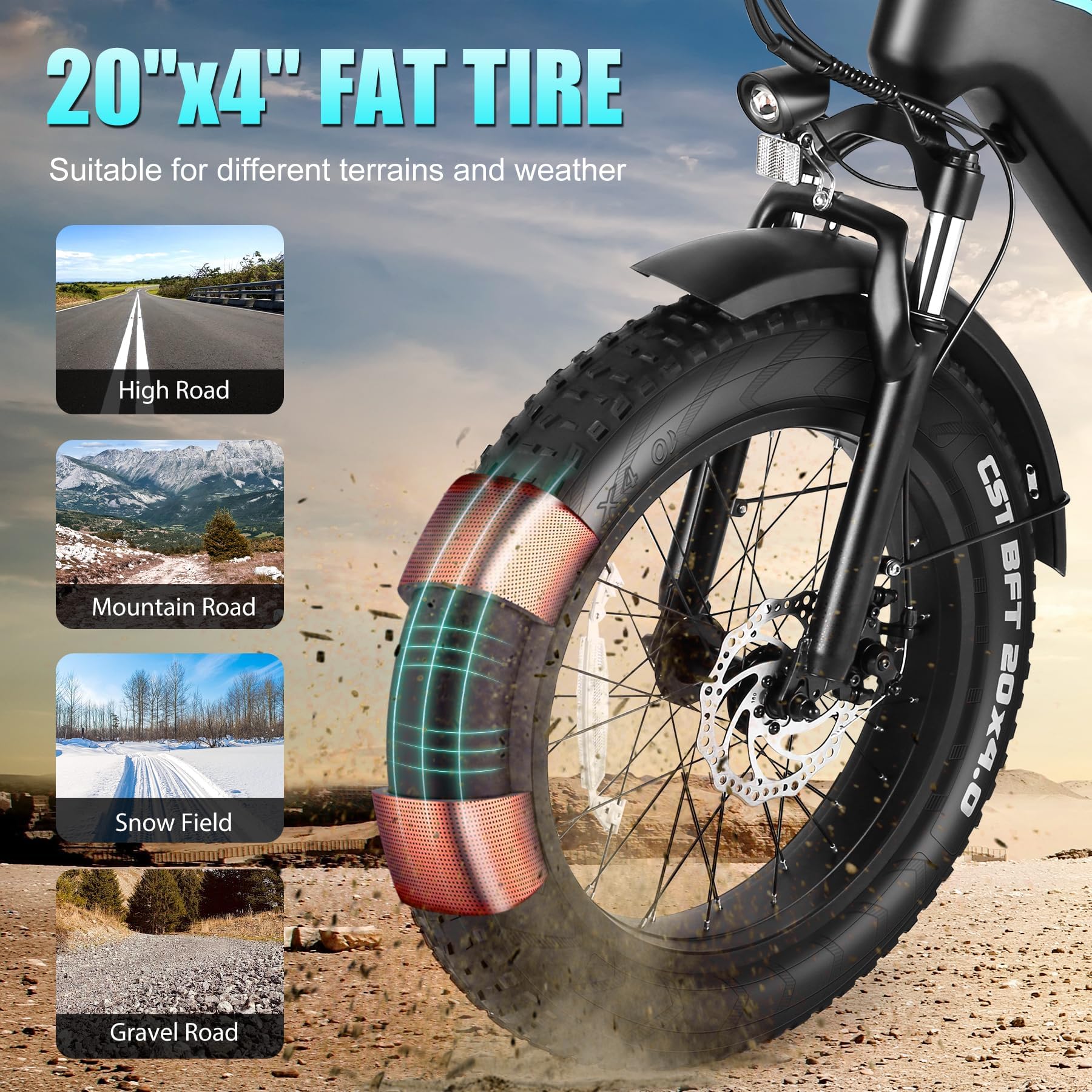 - 20"*4.0" Fat Tire: The fat tire electric bike is made of high-quality materials, which greatly improves the wear resistance of the tires. 20"*4.0" fat tires increase the contact area with the ground, make riding smoother and more stable, and allow you to ride freely on all terrain, including mountain roads, snow roads, sand roads, city roads, etc.