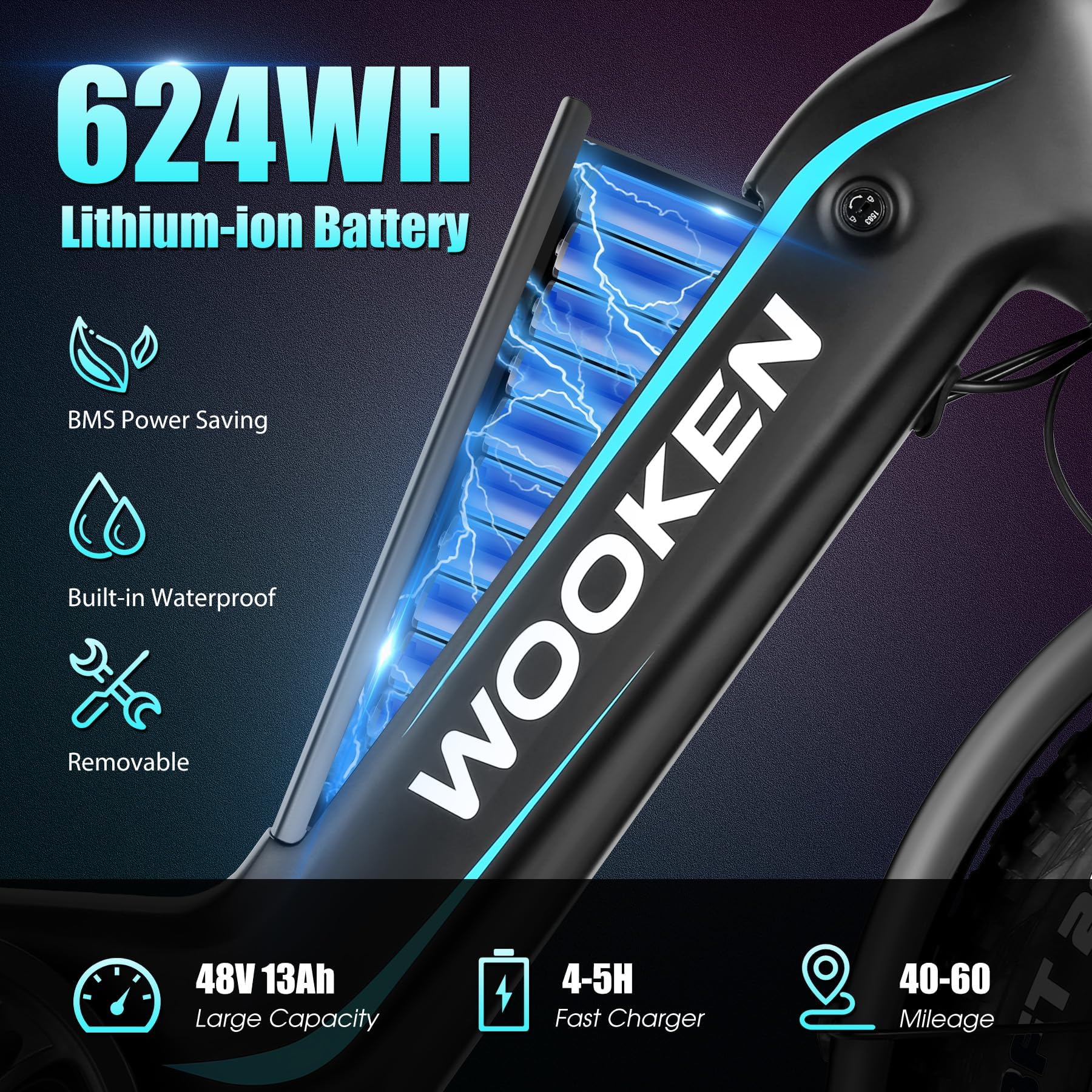 - 624Wh Built-in Removable Battery: The 48V 13Ah large capacity Lithium-ion battery of the ebike, can provide long-range riding miles, though under pure electric mode, up to 45 miles. Pedal-assist mode up to a max of 60 miles. Equipped with a 3A fast charger, full charging only takes 4-5 hours, reducing your waiting time. The built-in battery can keep it clean for a long time and is waterproof, removable design meets different charging needs, improving daily convenience.