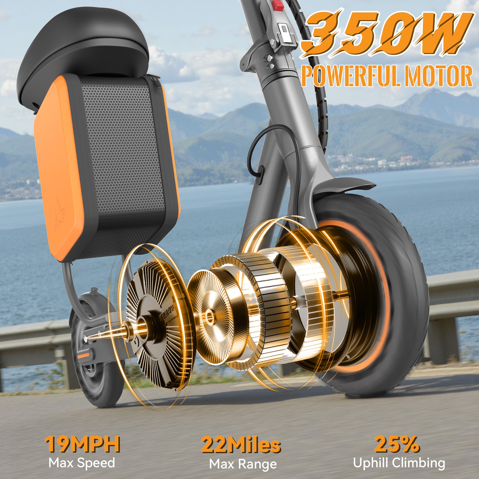 - 【 E Scooter Powerful Performance】The electric scooter Equipped with 350W( Peak 700W) powerful motor and high capacity battery, electric scooter allows for speeds up to 19mph and max range up to 21miles under specific conditions. Experience a breezy 20° uphill journey, 4 hours fast charging.Perfect for daily commuting or short trip. Max load is 265 lbs. This E-Scooter has UL2272 certified