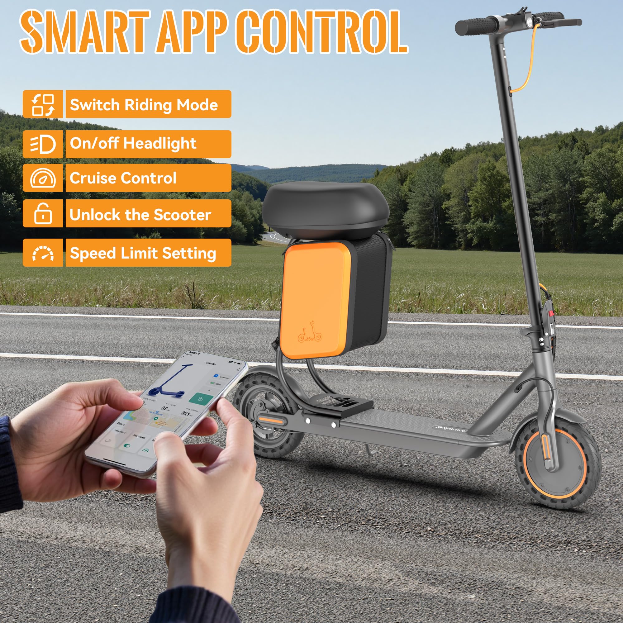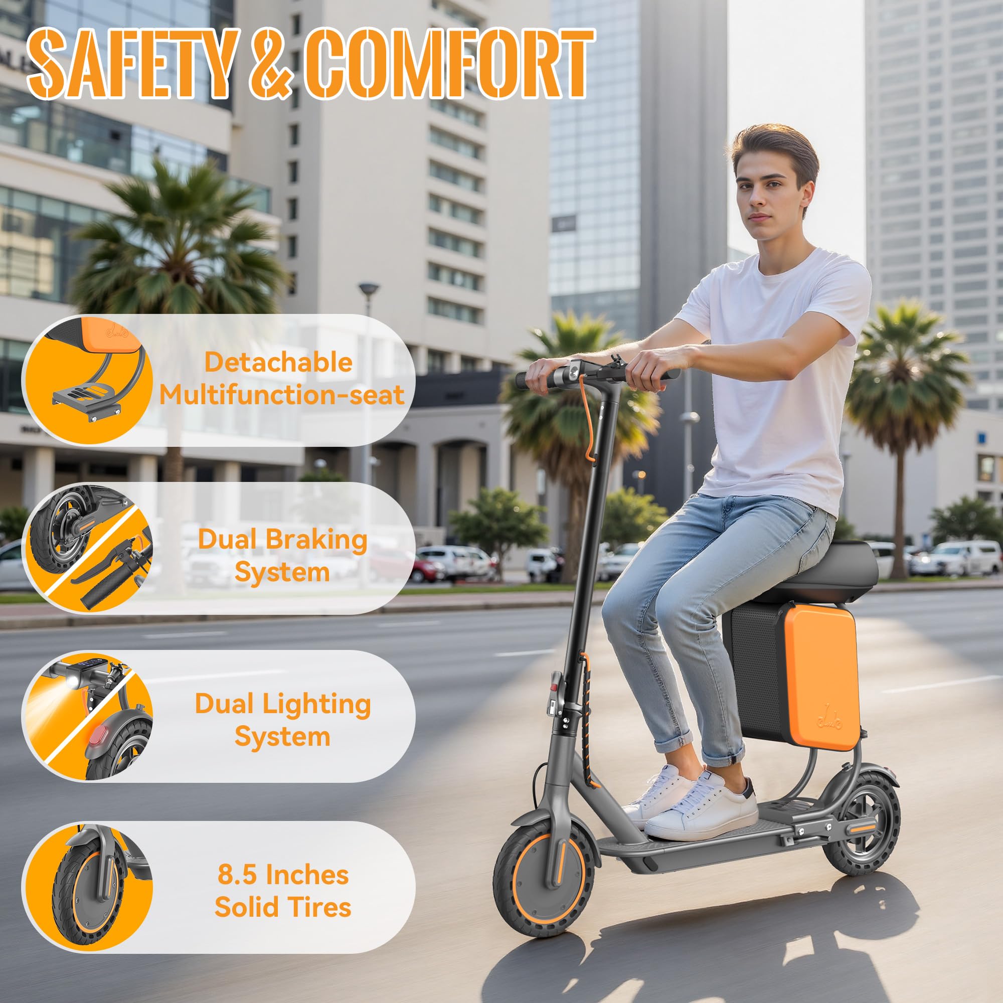 - 【Electric Scooter with Seat & Storage Box】 The 11L detachable Seat-Storage box holds laptops, groceries, or daily essentials, perfect for tools, picnic gear, or daily essentials. Enjoy versatile riding with a detachable seat, switching between standing and sitting