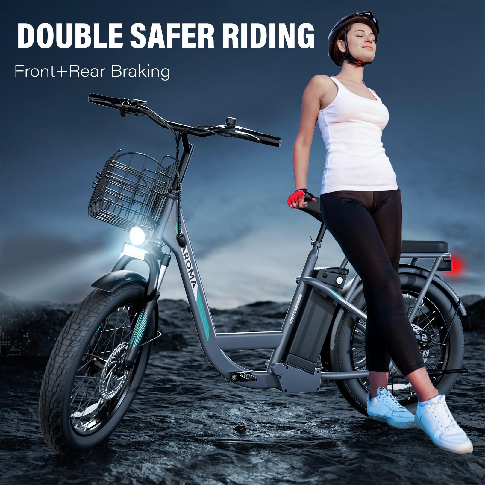 - 【Safe Riding Day & Night Ebike】The sensitive mechanical disc brakes provide sufficient braking power even in adverse conditions, with the front fork providing shock absorption when braking. Enhanced visibility with bell, LED front light and rear reflector ensures that night riding is just as safe as daytime riding. With these safety components, you can ride with confidence no matter the time or road conditions.