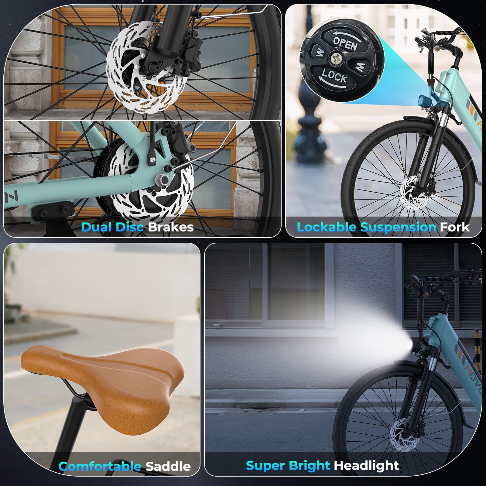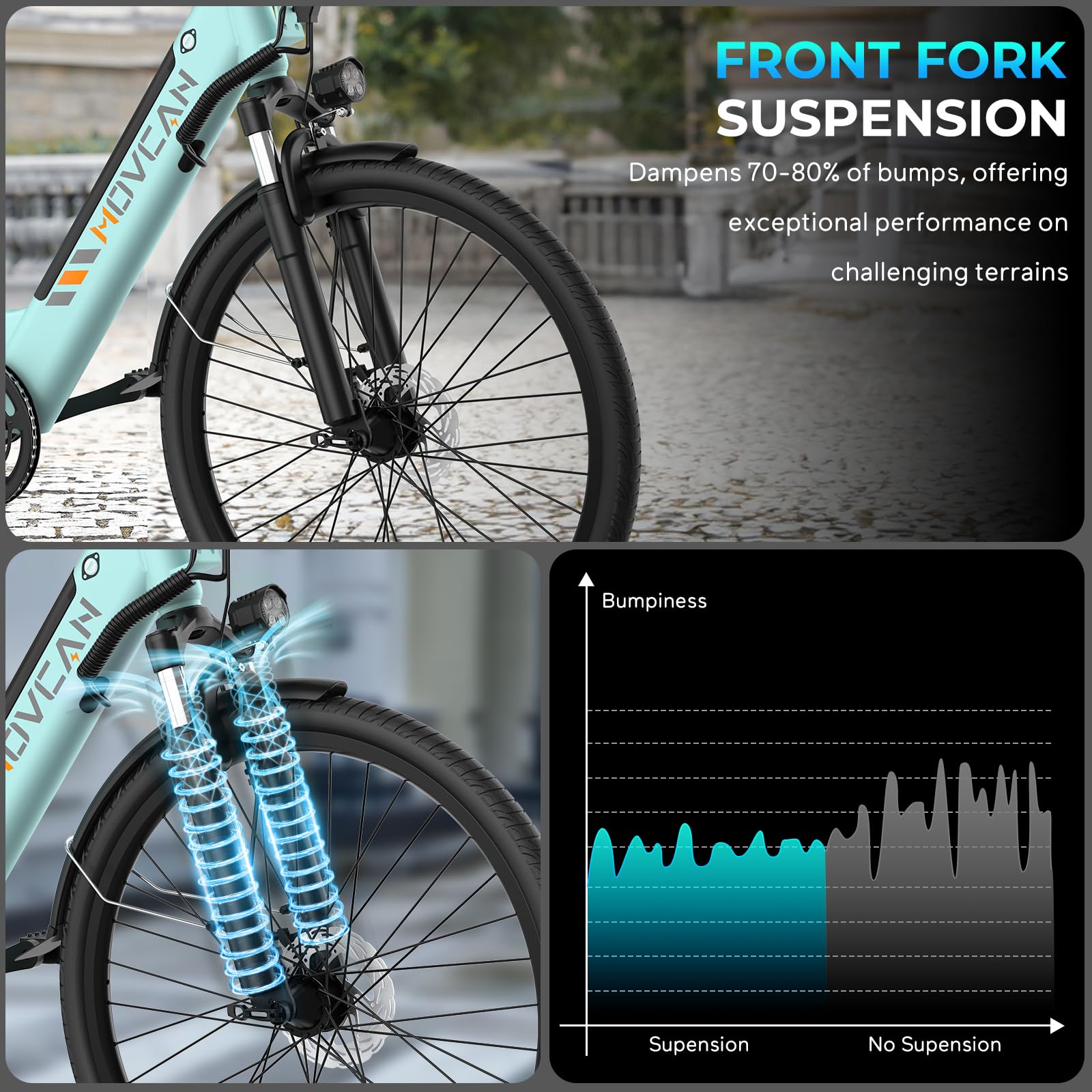 - 【Powerful 1000W Motor】Movcan V80 electric bike Built-in a 1000W(Peak 1500W)brushless hub motor, electric bike for adults can reach a top speed of 28MPH, robust motor delivering 80N.M torque, easily overcome 30° steep hills. You can enjoy a comfortable riding experience and powerful braking even on steep slopes, rugged terrain, or other extreme terrains.