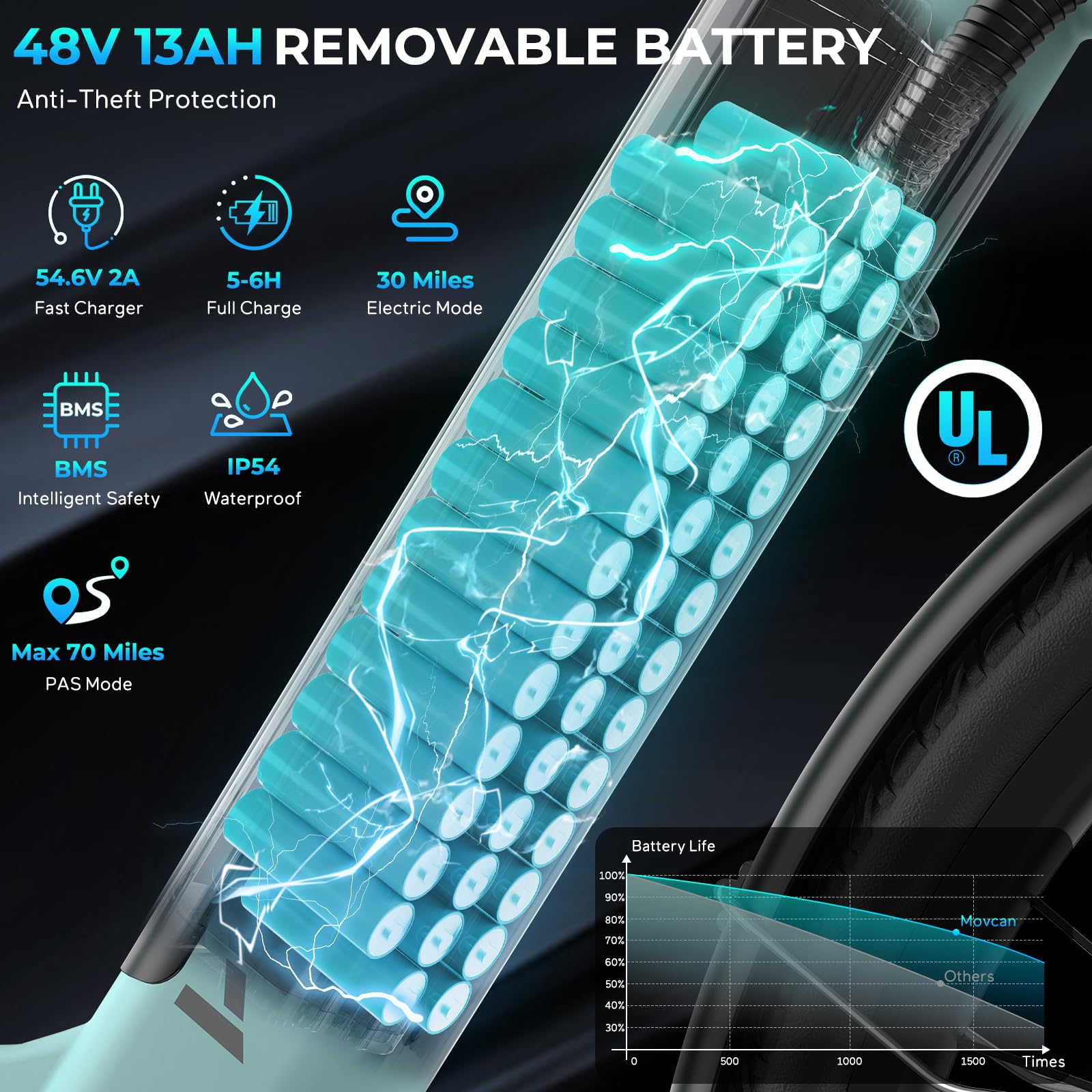 - 【48V 13Ah Removable Battery & Limitless Exploration】Ebikes is equipped with 48V 13Ah batteries, which are UL2849 certified and have a BMS system, greatly improve the safety factor. The removable design makes it more convenient to charge the battery at home or office. Providing up to 70 miles range per charge (PAS mode) and 30 miles in pure electric mode. Allowing you to go anywhere you want.