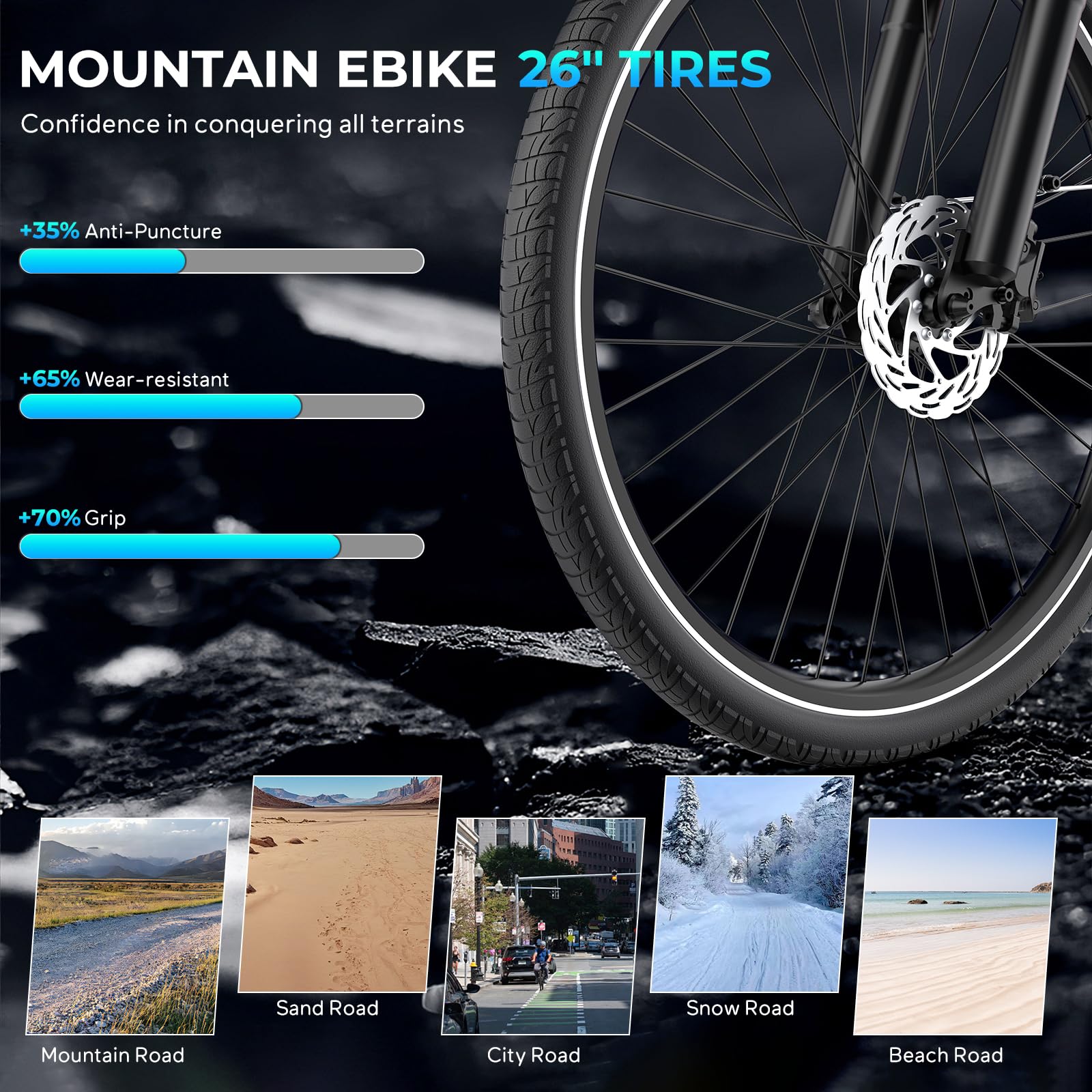 - 【26" All Terrain Tire】Puncture-resistant tire adopt 26"*1.95", providing better traction and a smoother ride, and the tread design reduces rolling friction and side slip, combined with front and rear brake, ensure excellent stability and comfort across all terrains, such as snow road, sand road, gravel road, and the height of 26inch tire is suitable for most adult men and women.
